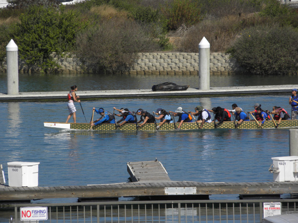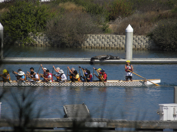 This dragon boat crew is also so intent on rowing that they don’t see the sea lion either. But he’s laid back down again.