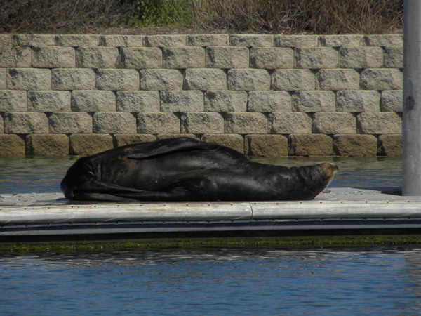 The last several years we’ve been here in Alamitos Bay we have had a visiting sea lion every now and then. My mom in Arizona calls him “her seal” because we first saw him when she was visiting us. She always asks if we’ve seen him lately. We went for a long time without seeing him – once or twice a year. Today he was sunning himself on the breakwater. He didn’t seem to care at all that boaters were going by him all the time. This Google map has a red star in the center – the sea lion was on the breakwater just below the star – on the thin line jutting in the water. You can drag the map up and around so you can see how he made his way up to the houses from the ocean near Seal Beach. Here are some pictures I took of him this morning.