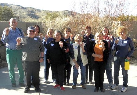 High Desert Daffodil Society members show off the daffodil cookies: Front Row L to R: Steve Miller, Carolyn Jensen, Leslie Dattel, Susan Duncan, Joyce Seelen. Back Row L to R: Dan Williams, Darcy Anderson, Cathy Logan, Patricia Eisenberg, Nancy Tackett (Speaker), and Erin Logan.